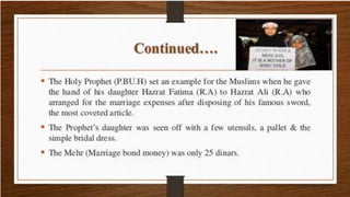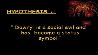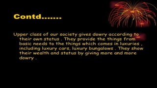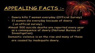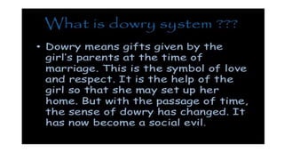Dowry is an un-Islamic practice that originated in Hindu communities as a wedding gift from the bride's family to the groom's. In Pakistan, it is called jahez and involves excessive demands for cash and goods from the bride's family by the groom and his family. This practice leads to torture and even death of women if the demands are not met, as seen in the examples of Sakina and Khalida. Pakistan has high reported rates of dowry-related deaths but existing laws have not been effectively enforced to eliminate this harmful tradition. While most people agree that dowry should end, there are mixed views on legally banning it and on its role in female infanticide.