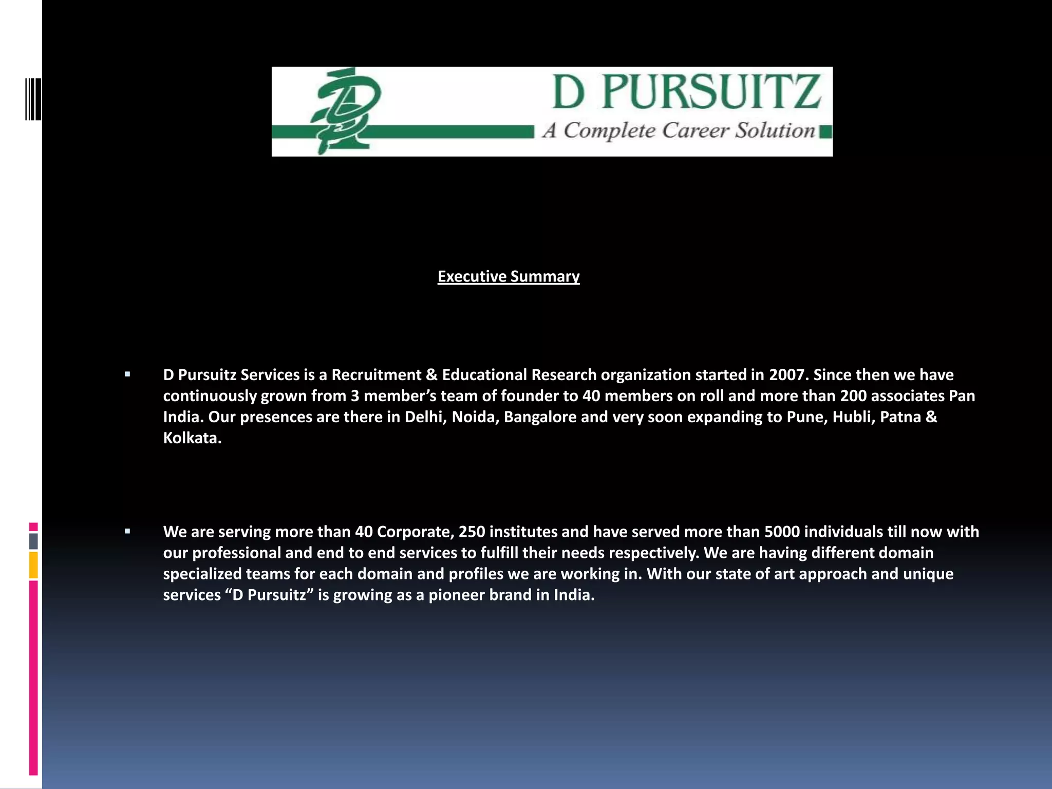 (1) D Pursuitz Services is a recruitment, educational research, and consulting organization operating in India since 2007. It has grown from 3 founders to 40 employees and serves over 40 corporate clients, 250 educational institutes, and 5000 individuals.