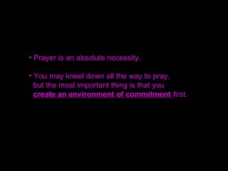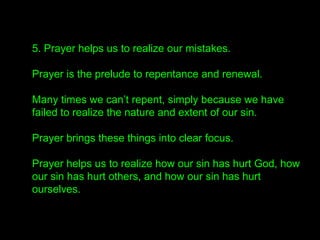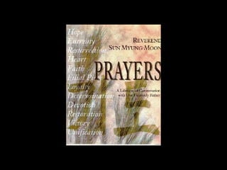 Prayer was the focus of Jesus' life and is central to many religions. The document discusses how prayer is the core of religious life and the direct line of communication to God and the spirit world. It provides quotes emphasizing the importance of prayer from various religious and historical figures. It suggests that if key biblical figures like Eve, Adam, the Pharisees, John, and Saul had prayed, tragic outcomes could have been prevented or altered. Prayer is presented as bringing truth and being the medium through which love is received and expressed through miracles.