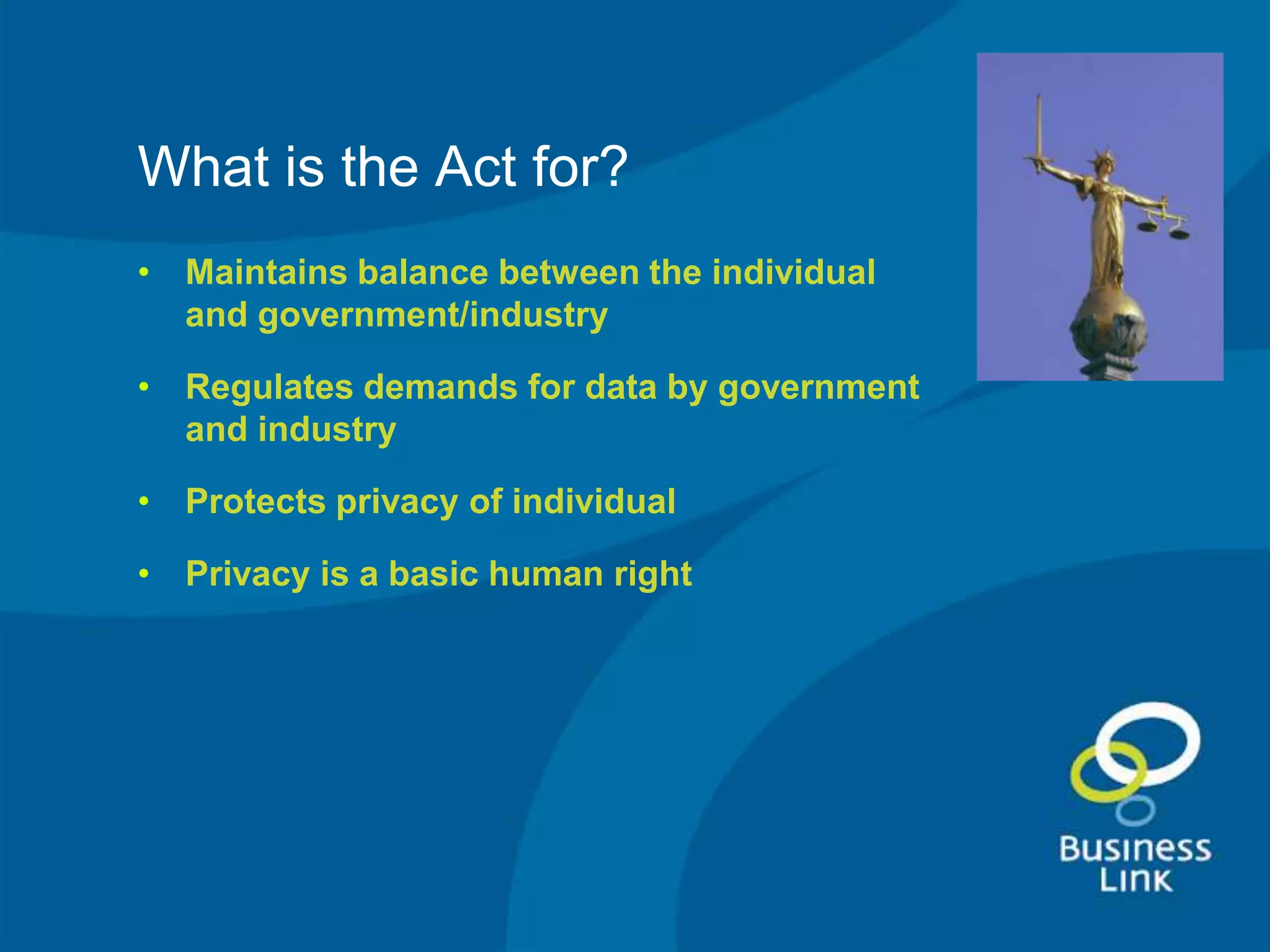 This document provides an overview of data protection laws and principles. It summarizes the key aspects of the UK Data Protection Act, including its purposes of balancing individual privacy rights with legitimate data use by organizations. It outlines the 8 data protection principles around fair and lawful processing, purpose limitations, data minimization, accuracy, storage limitations, individual rights, security safeguards, and international data transfers. The roles of the Information Commissioner's Office and common data protection concepts and compliance requirements are also summarized.