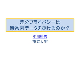 このスライドでは、(1)差分プライバシーの基礎入門と、(2)差分プライバシーを時系列データに適用する方法に関する最近の4本の論文を紹介します。