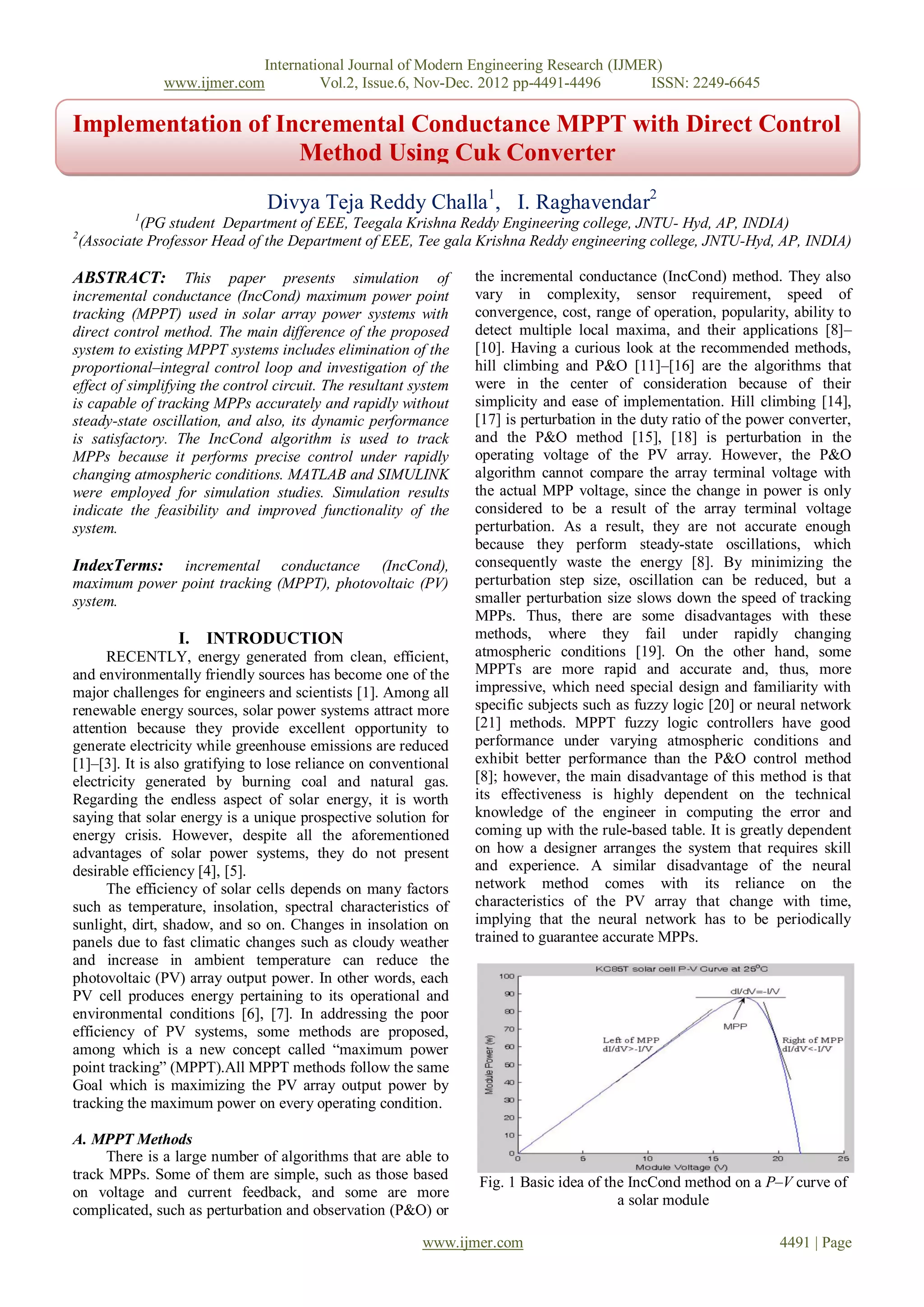 This document summarizes a research paper that presents a simulation of incremental conductance maximum power point tracking (IncCond MPPT) used in solar array power systems with a direct control method. The proposed system eliminates the proportional–integral control loop typically used in MPPT systems. The IncCond algorithm is used to track the maximum power points as it performs precise control under changing atmospheric conditions. Simulation results using MATLAB and SIMULINK indicate the feasibility and improved functionality of the proposed system.