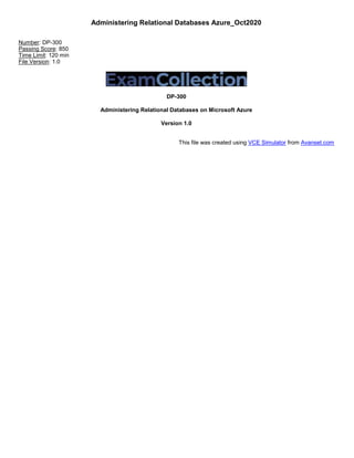 This document describes a case study for the DP-300 exam on administering relational databases on Microsoft Azure. It provides background on the existing environment including the network, identity, and database configurations. It then outlines requirements, planned changes, technical requirements, security and compliance requirements, and business requirements for the scenario. The first question asks about migrating databases from an on-premises SQL Server to Azure SQL Database and minimizing downtime. Subsequent questions cover topics like compression, migration options, and backup configurations.