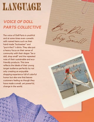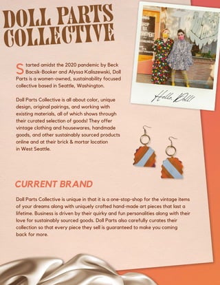 Doll Parts Collective is a women-owned collective based in Seattle that sells vintage clothing, handmade goods, and other sustainably sourced products. It was started in 2020 by Beck Bacsik-Booker and Alyssa Kaliszewski and offers a unique one-stop shop for vintage items and handmade art. The collective aims to be creative and unique while focusing on sustainability through existing materials. It markets through its website, Instagram, Facebook, and in-person location and measures success by its environmental impact and community support.