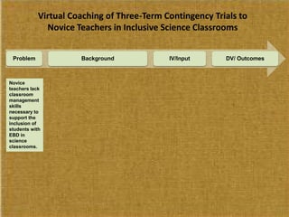 This study examined the effects of virtual coaching on novice science teachers' use of three-term contingency trials with students with emotional and behavioral disorders. Three novice teachers received immediate feedback via Bluetooth earpieces to complete contingency trials with students. Results showed the intervention increased teachers' use of praise, feedback, and mastery of evidence-based practices. It also increased students' correct responses and reduced problem behaviors. Teachers maintained these behaviors after coaching ended. The study employed valid methods and extended research on virtual coaching to inclusive science classrooms.