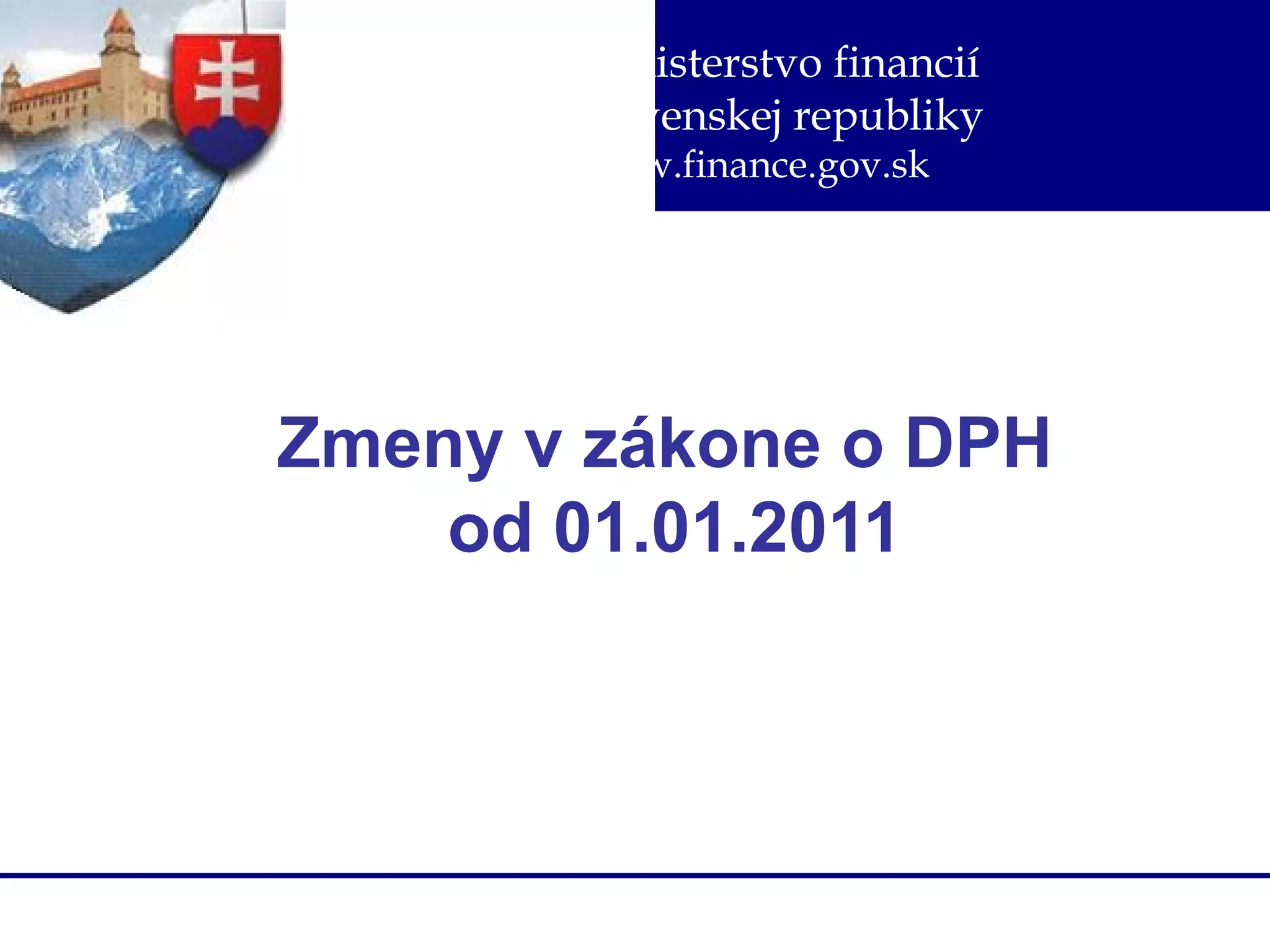 Zmeny v sadzbáchdane § 27, § 85j ods. 1 zákona o DPH S účinnosťou od 1.1.2011 sa menia sadzby DPH V § 85j ods. 1 zákona o DPH sa zavádza dočasné zvýšenie základnej sadzby dane z 19 % na 20 % Zvýšenie základnej sadzby dane o 1 % je dočasným opatrením, ktorého platnosť skončí, keď schodok verejnej správy SR dosiahne úroveň menej ako 3 % Skončenie obdobia uplatňovania základnej sadzby dane 20 % vyhlási Ministerstvo financií SR všeobecne záväzným právnym predpisom (vyhláškou) Znížená sadzba dane 6 % na tzv. predaj potravín z dvora (mäso, ryby, mlieko, vajcia, med) sa zrušuje Znížená sadzba dane 10 % platí naďalej (tovar v prílohe č. 7 zákona o DPH) Zdenka Jablonková