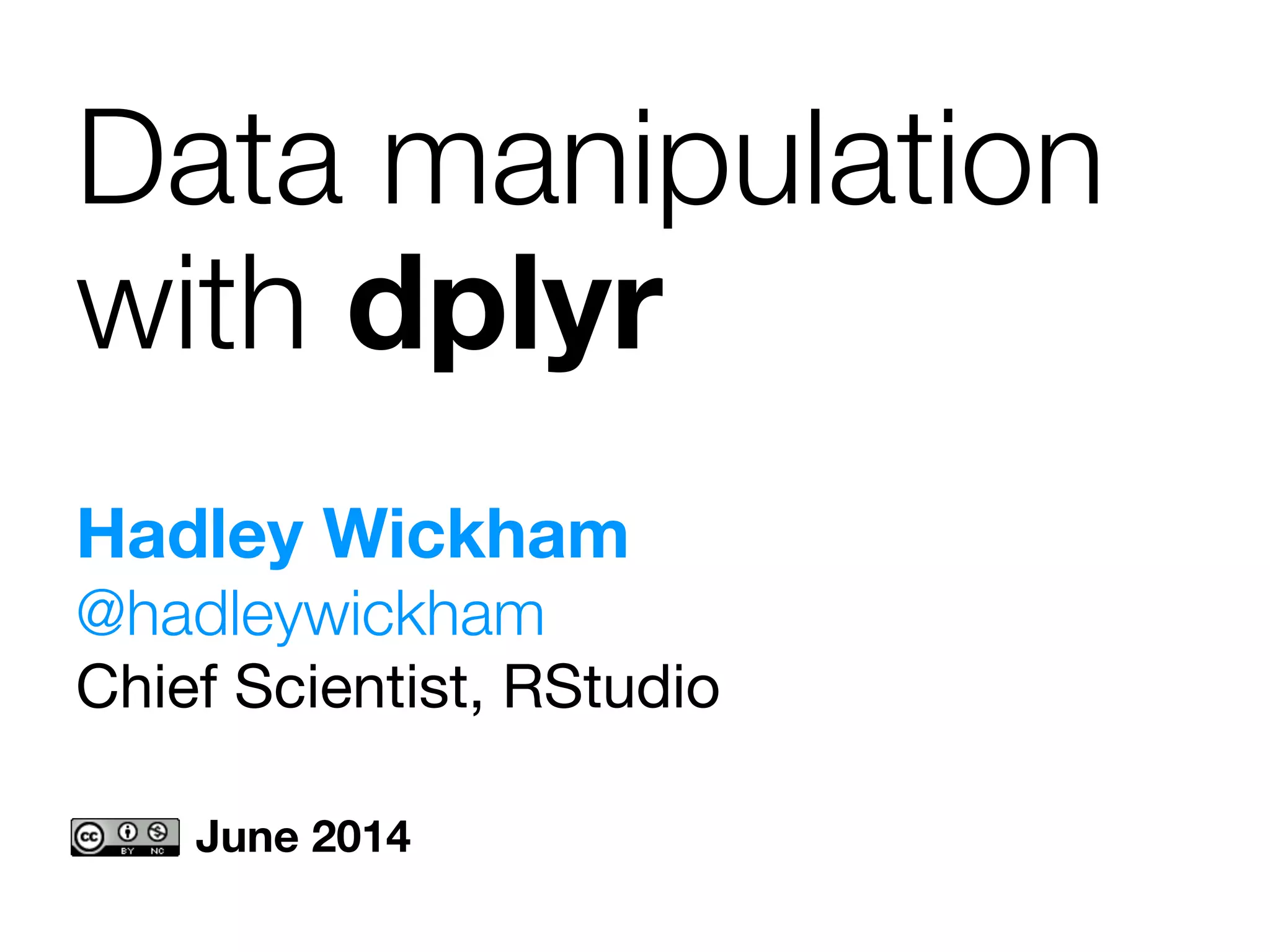 This document provides an overview of data manipulation techniques using the dplyr package in R. It begins with an introduction to core dplyr verbs like filter(), select(), arrange(), mutate(), and summarise() for manipulating single tables of data. It then demonstrates how to perform grouped operations using group_by() with summarise() and how to chain multiple operations together into data pipelines using the pipe operator %>%. Finally, it shows how to use grouped mutate() and filter() with window functions to create and filter rows based on group-level calculations. The document uses flights data to demonstrate these techniques throughout.