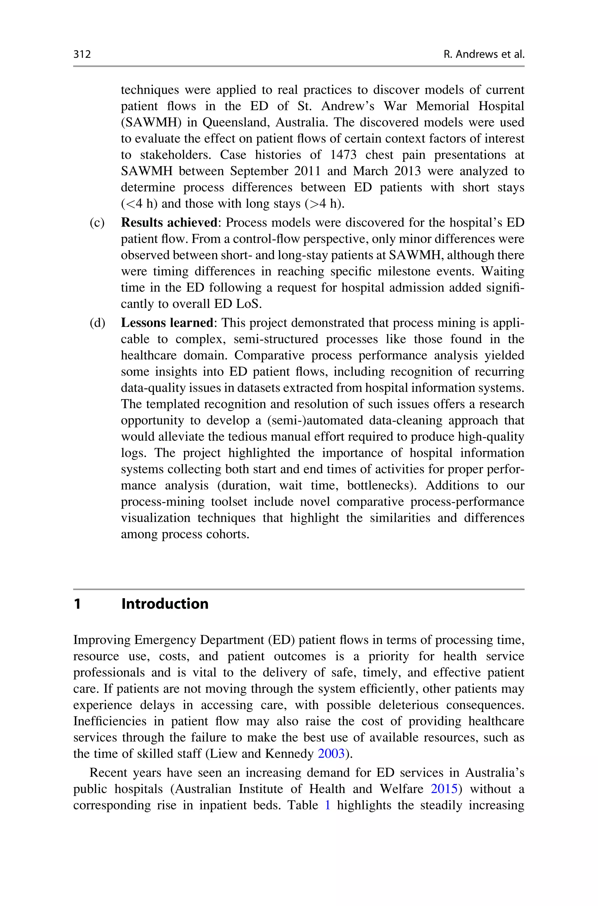 The document analyzes how to improve patient flows in the emergency department (ED) at St. Andrew's War Memorial Hospital by employing process mining techniques. It addresses issues such as overcrowding and long patient waits, emphasizing the importance of identifying process inefficiencies and understanding patient flow variations, particularly among chest pain patients. Results revealed minor differences between short and long ED stays, with suggestions for enhanced data collection and process visualization methodologies to streamline patient care.