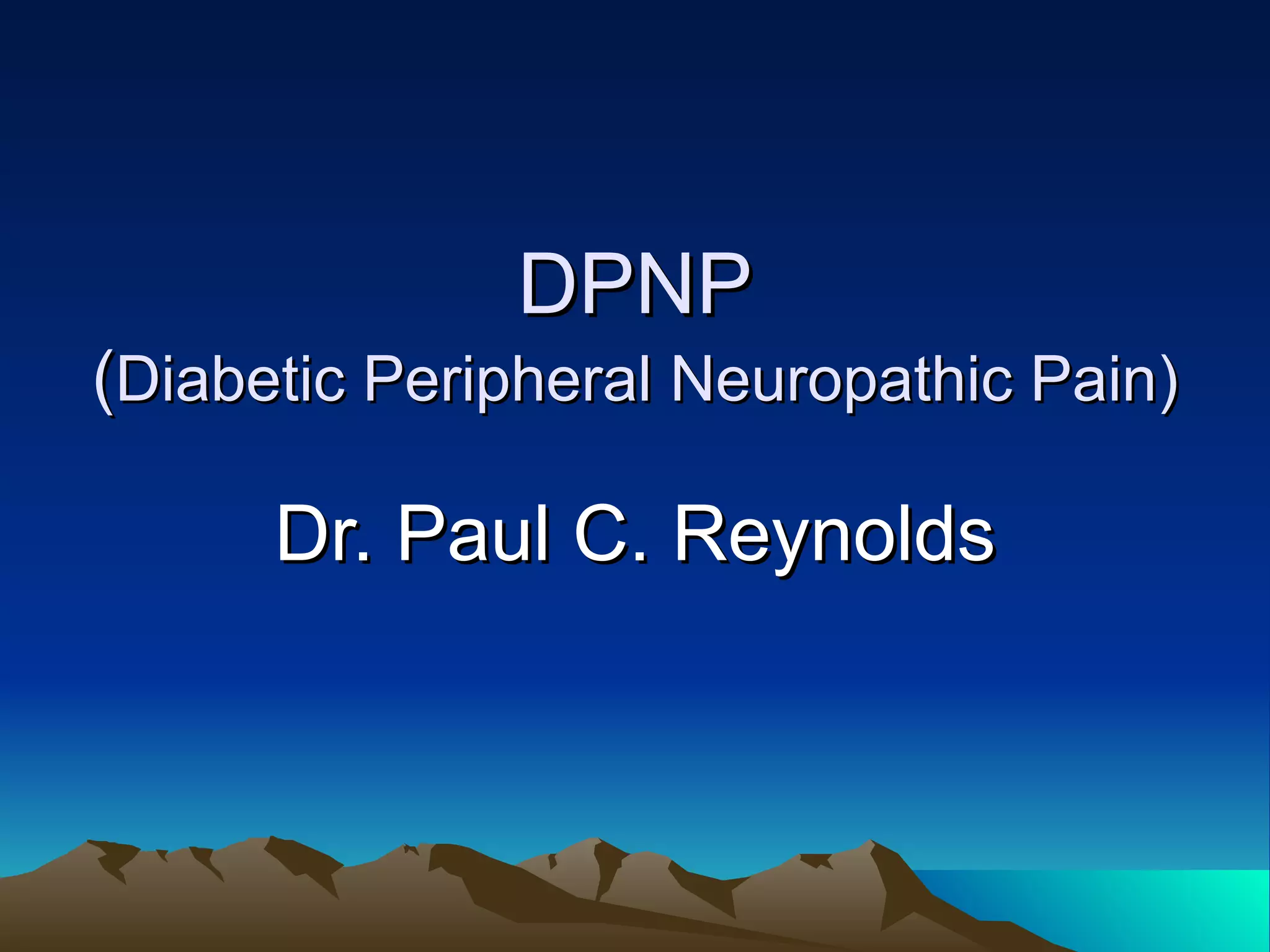 The document discusses recommendations for treating diabetic peripheral neuropathic pain (DPNP) created by a consensus group in 2005. It provides an overview of DPNP, including definitions, incidence rates, assessment tools, management guidelines, and recommendations for first- and second-tier medication treatments. It also covers the typical clinical presentation of DPNP and importance of foot care to prevent ulcers and amputations.