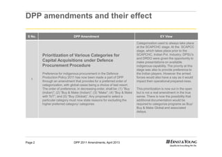 The document summarizes amendments made to India's Defence Procurement Procedure (DPP) in 2011 and their expected effects. Some key amendments include prioritizing indigenous procurement, releasing the long term procurement plan, simplifying procedures for "Make" and "Buy and Make (Indian)" categories, defining indigenous content, and resolving tax issues to boost the domestic defence industry. The amendments aim to increase transparency, expedite procurement, and encourage wider participation of Indian private companies in defence production.