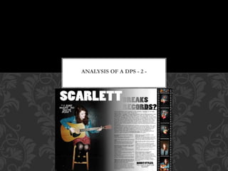 This document analyzes a digital press sheet (DPS) for a magazine article. It summarizes that the article takes up two pages in the magazine, indicating its importance. There is a block of text on one page with two columns underneath. The main body text fills most of a single page, providing substantial content for readers. The title is larger than the rest of the text to draw attention. A pull quote is placed next to the main image to clearly link it to the subject. The photos are all studio shots of an acoustic guitarist, suiting the magazine's focus on acoustic music. An old film frame around most photos gives a subtle classic feel, hinting at the subject's genre.