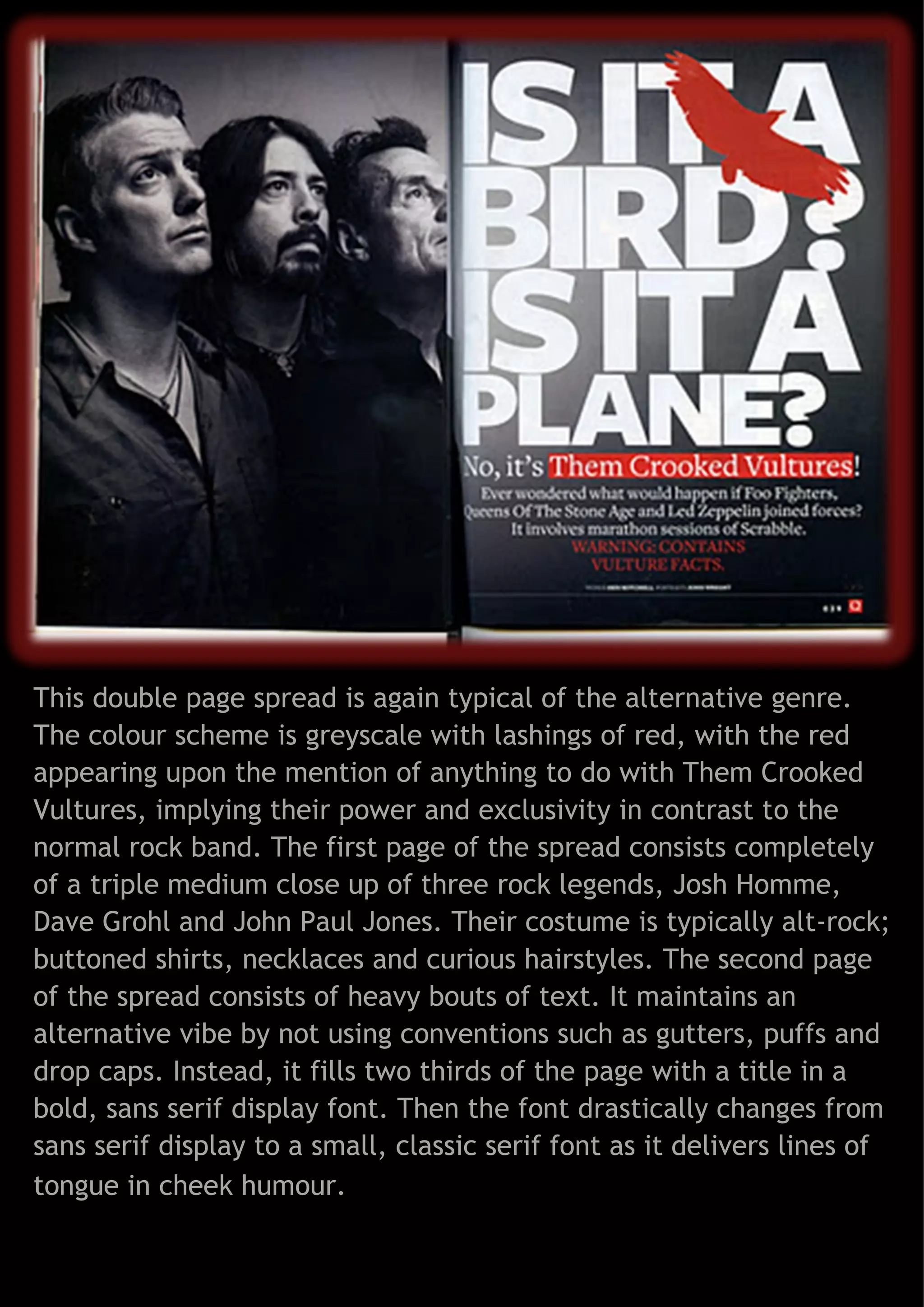 The double page spread uses a greyscale color scheme with red highlights to imply the power and exclusivity of the rock band Them Crooked Vultures. The first page features a triple close-up of the band members Josh Homme, Dave Grohl and John Paul Jones in typical alt-rock costumes. The second page has heavy blocks of text maintaining an alternative style without typical conventions, instead using differing fonts including a bold sans serif title and smaller serif body text delivering tongue-in-cheek humor.