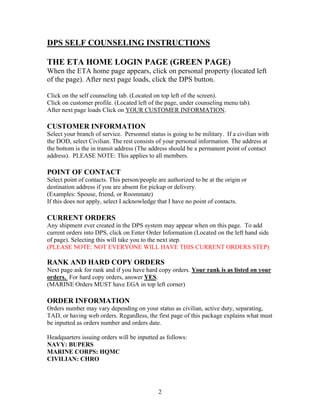 The document provides instructions for Marines to self-counsel their household goods shipment using the Defense Personal Property System (DPS). It outlines the steps to set up a DPS account, enter orders information, create a shipment, and schedule pickup and delivery dates. Marines are instructed to bring signed DPS forms and supporting documents to the Distribution Management Office (DMO) 20 days before their scheduled pickup date to have their shipment processed.
