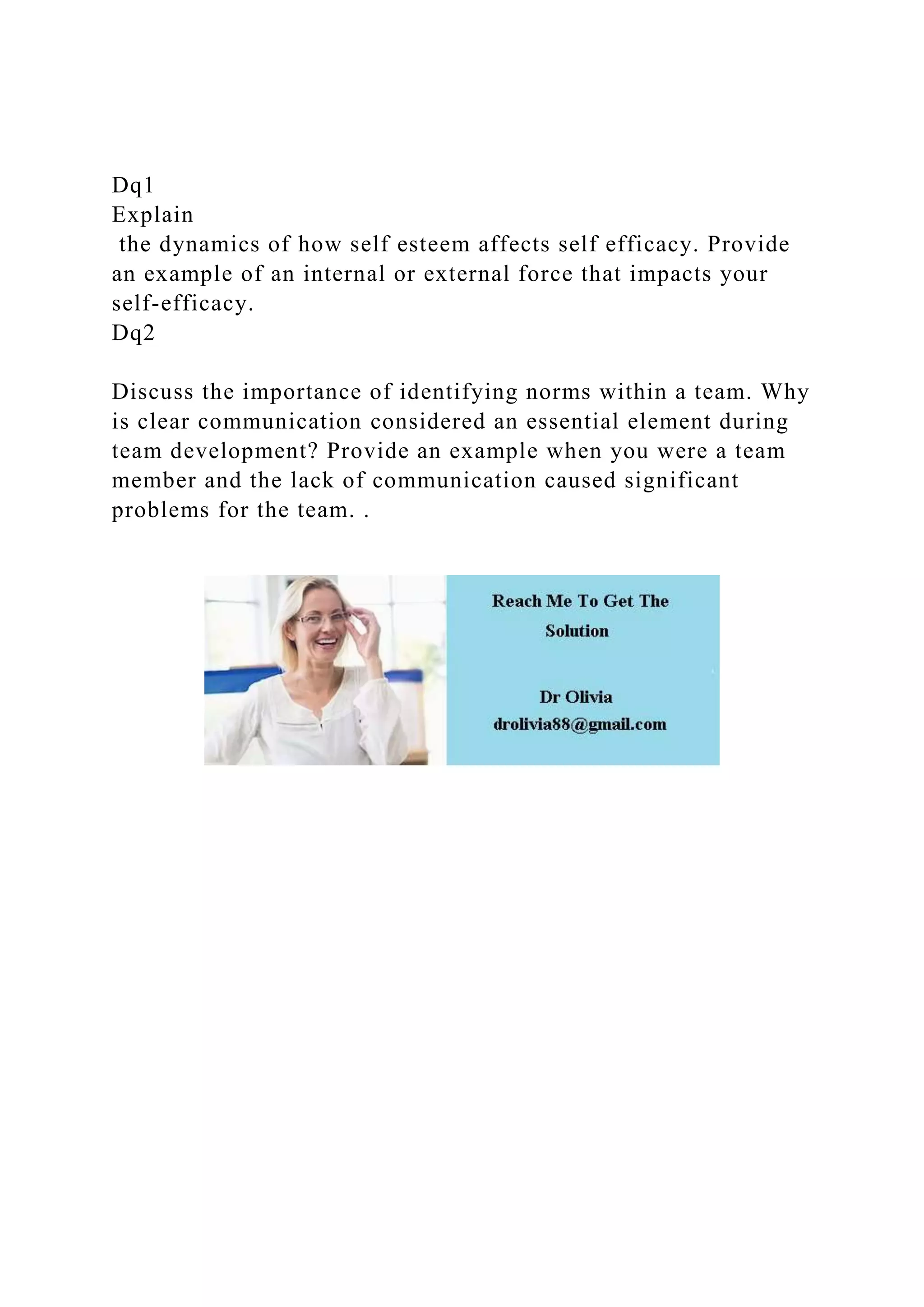 The document discusses the relationship between self-esteem and self-efficacy, highlighting how one's confidence can influence their ability to perform tasks. It emphasizes the significance of identifying team norms and the critical role of clear communication in team dynamics. An example is requested regarding past experiences where communication failures impacted team effectiveness.