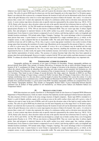 The document provides a comprehensive review of Digital Elevation Models (DEMs), exploring their applications in terrain analysis and image processing. It discusses various remote sensing techniques for acquiring terrain data, different interpolation algorithms, and the data structures used to represent DEMs, including raster grids and triangulated irregular networks. Additionally, it highlights the importance of topographic attributes in enhancing DEMs for various fields such as military, environmental science, and urban planning.
