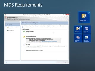 This document provides an overview of Data Quality Services (DQS) matching and Master Data Services (MDS). It discusses record matching, data issues that affect matching, the DQS matching process, and key components like the matching policy and knowledge base. It also introduces MDS and its configuration tools.