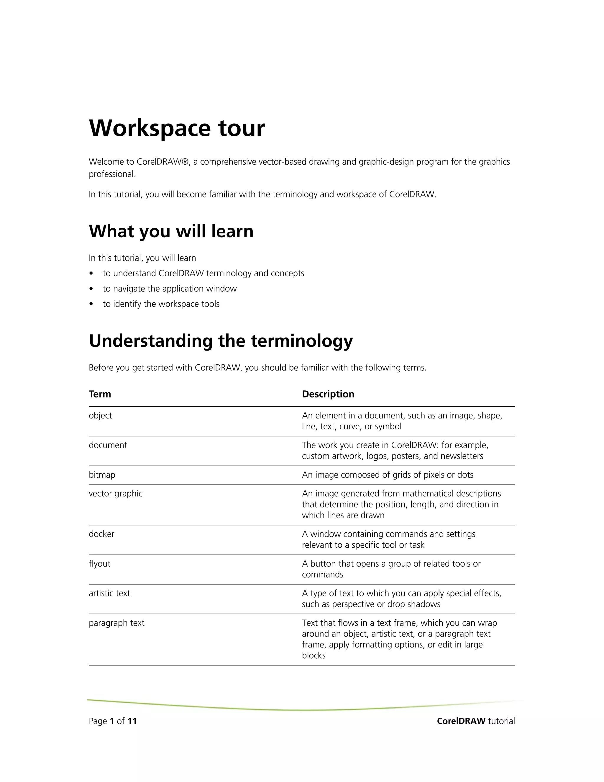 This document provides an overview of the CorelDRAW workspace, including its key components and tools. It describes the application window, toolbars, property bar, dockers, status bar, color palette, and toolbox. The tutorial explains how to navigate the workspace, select tools, and understand CorelDRAW concepts and terminology to get started using the vector graphics software.