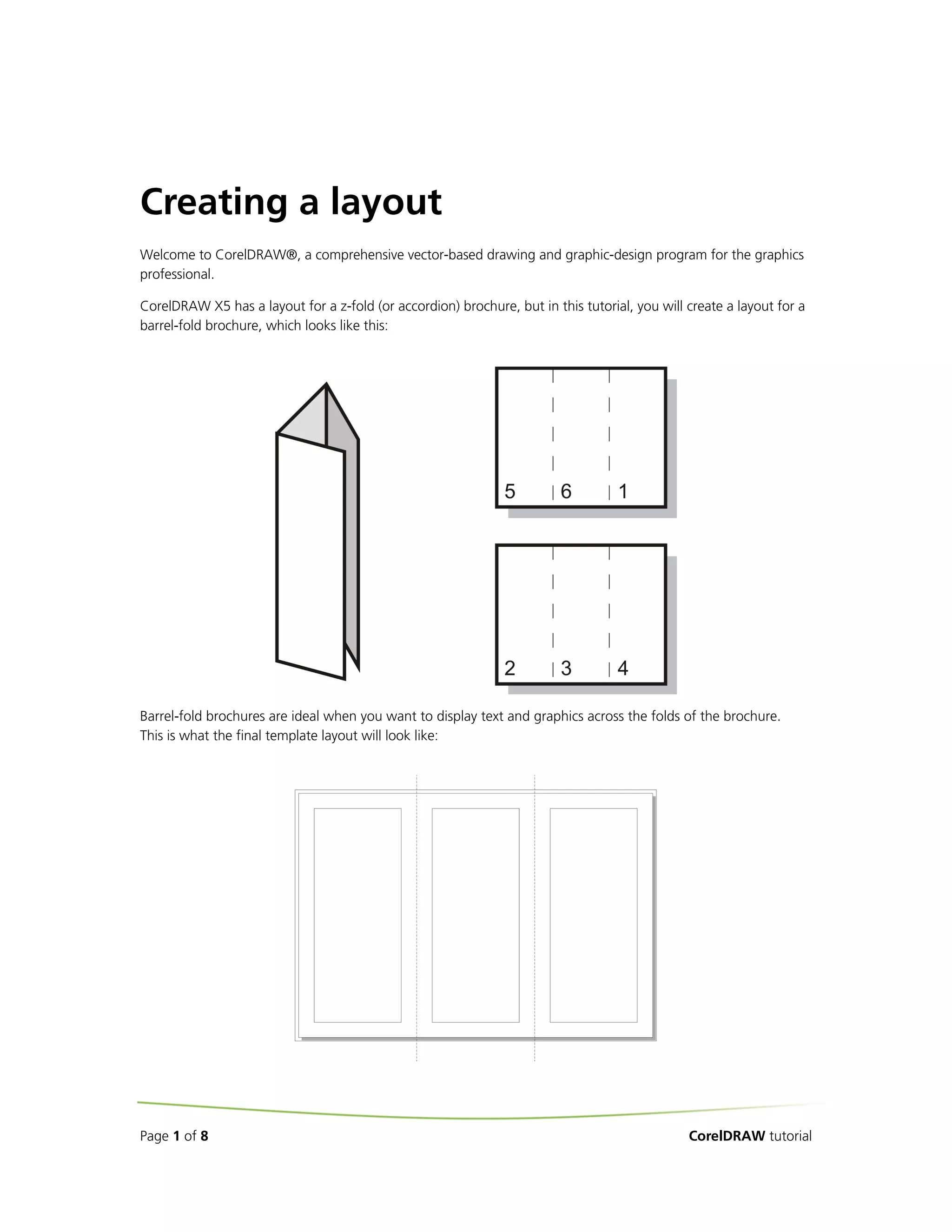 This document provides instructions for creating a layout template in CorelDRAW for a barrel-fold brochure with three panels. The steps include setting the page size to A4 landscape, adding guidelines to divide the page into three equal sections, creating master layers for bleed areas and printing margins, setting up 3mm bleeds and 12mm print margins using rectangles, and saving the finished layout as a template for a tri-fold barrel brochure.