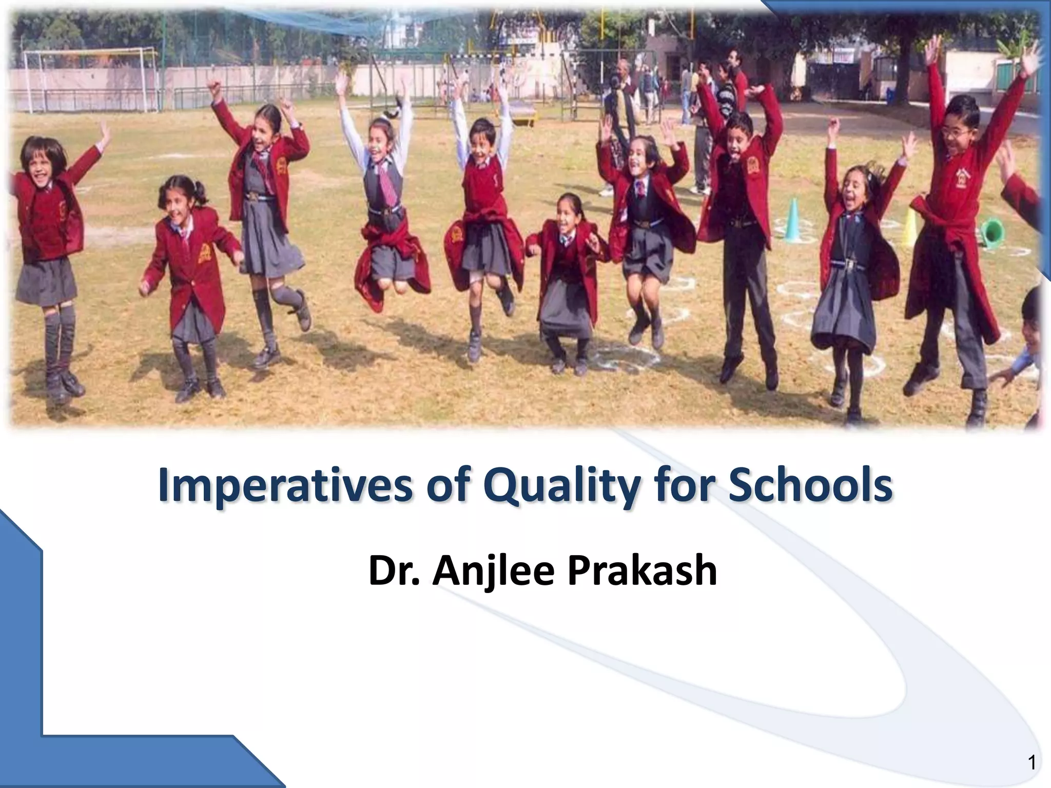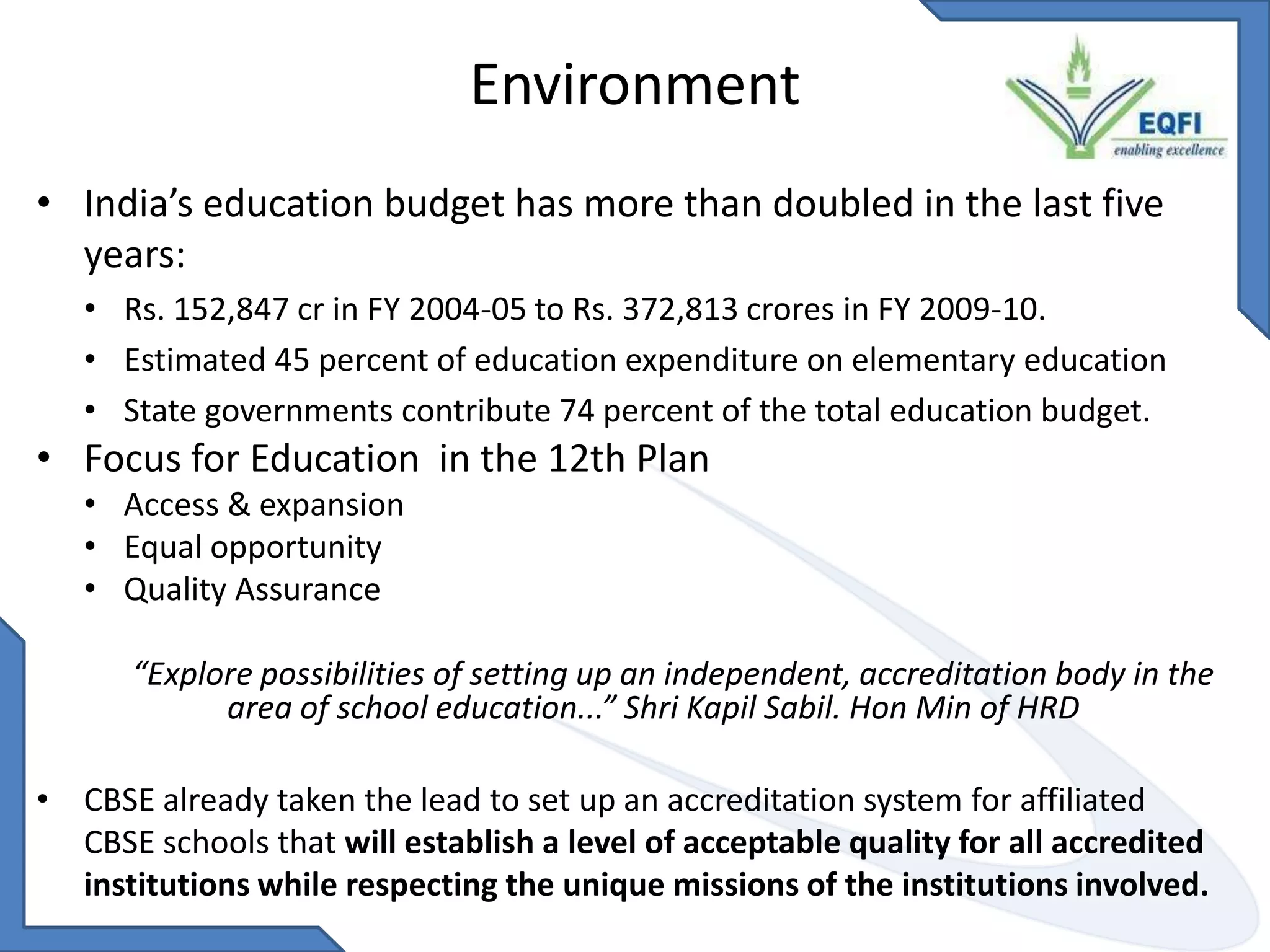 The document discusses the significant increase in India's education budget aimed at improving the quality of school education, emphasizing the need for an independent accreditation body. Quality assurance is defined as a systematic process to ensure educational institutions meet minimum standards, focusing on comprehensive assessment and stakeholder satisfaction. It outlines standards for accreditation, highlighting governance, infrastructure, teaching, and management as key components to achieve educational excellence.