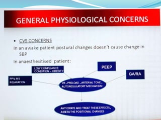 Patient positioning during anesthesia and surgery requires careful consideration of anatomical and physiological factors to prevent injury. The surgical position, procedure details, and patient characteristics and risks must be assessed to choose a position that allows procedure access while avoiding interference with breathing, circulation, nerve compression, or pressure points. Common positions like supine, lithotomy, lateral, and prone each have specific techniques, considerations, and potential risks that the anesthesia team must understand and address.