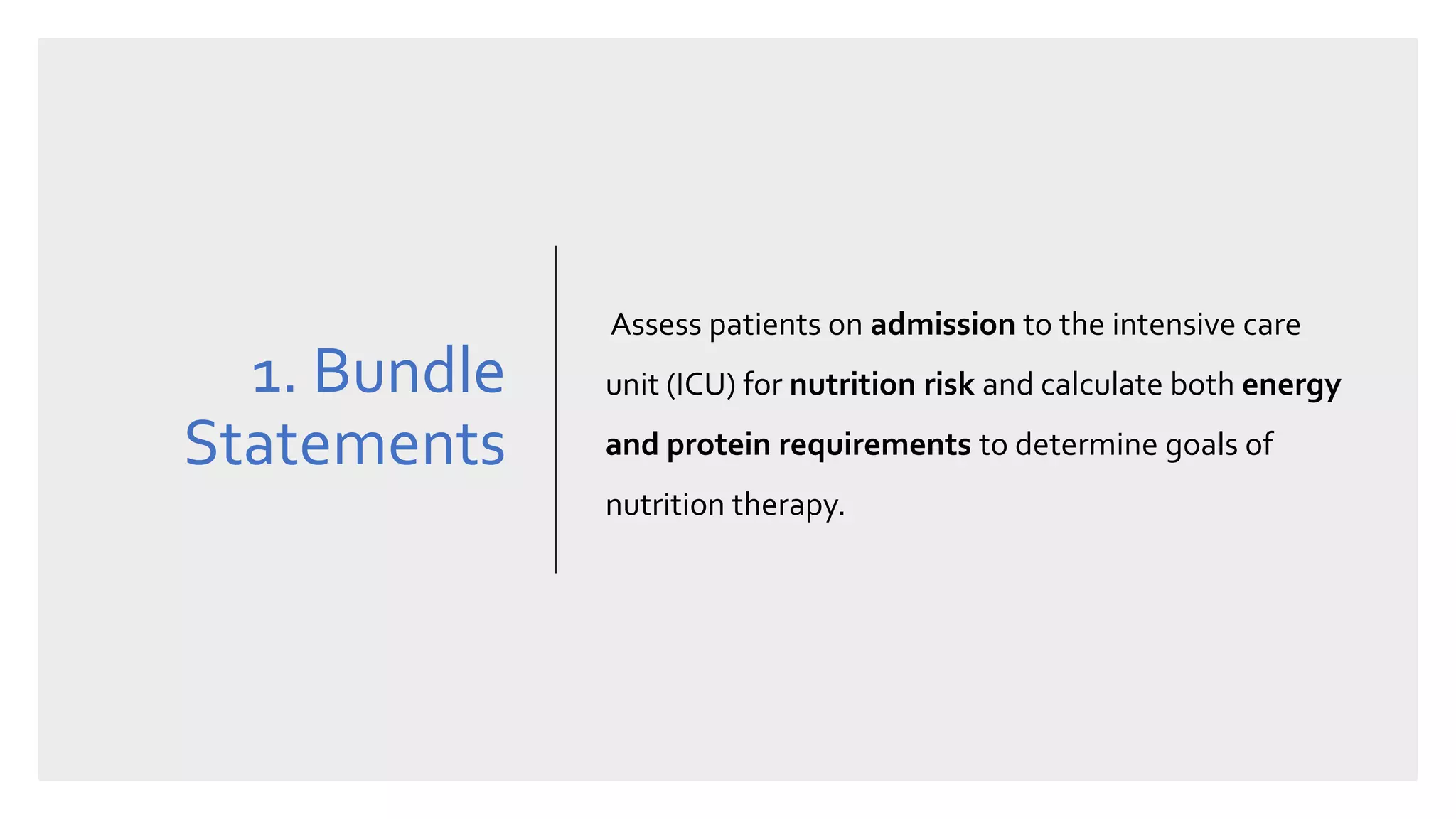 The document outlines 6 statements that form an ASPEN bundle for providing nutrition to patients in intensive care units. The statements recommend: 1) assessing patients' nutrition risk and determining energy and protein goals, 2) initiating enteral nutrition within 24-48 hours and increasing to goals over a week, and 3) taking steps to reduce risks like aspiration and improve tolerance for enteral feeding.