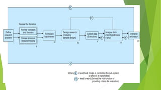 The other steps include preparing a research design, determining a sample, collecting and analyzing data, testing the hypothesis, and preparing a report on the findings. The steps do not always follow a linear order and the researcher must anticipate how each step informs the next throughout the process.