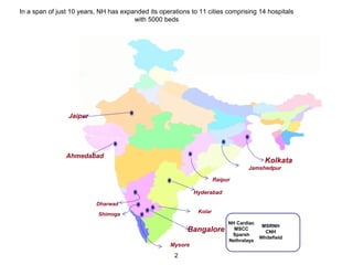 The document describes Narayana Hrudayalaya, a chain of hospitals in India providing affordable heart surgery and healthcare. It details how NH has expanded to 14 hospitals across 11 cities with 5,000 beds. It discusses how NH aims to make heart surgery affordable and accessible for most Indians by performing a high volume of surgeries at a low cost of $800 per surgery. It also outlines NH's various initiatives like micro health insurance, telemedicine, and training programs that aim to address India's shortage of doctors and nurses to further improve healthcare access and outcomes.