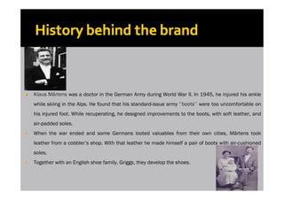Klaus Märtens designed improved army boots with soft leather and air-padded soles while recovering from an injury in 1945. After the war, he made himself a pair with air-cushioned soles using leather from a cobbler's shop. Together with an English shoe family, Griggs, they developed the shoe further, adding trademark yellow stitching and branding the soles as "Air Wair", now often known as Doc Martens.