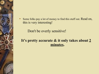 The document presents a personality test created by Dr. Phil, where participants score themselves based on their answers to ten questions. The test aims to provide insights into one's character and how others perceive them, with interpretations based on the total score. It encourages sharing the test with friends by forwarding it along with their scores.