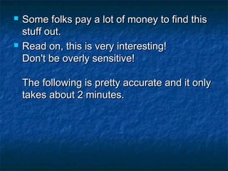 This document contains instructions for a personality test consisting of 10 multiple choice questions. It provides the questions, possible answers for each question labeled with letters, and a scoring system that assigns points to each answer. It then outlines different personality profiles that correspond to various total point ranges obtained from the test. The profiles describe how others may perceive someone's personality based on their test score. The document encourages the reader to take the test, share it with others, and include their score in the email subject line.