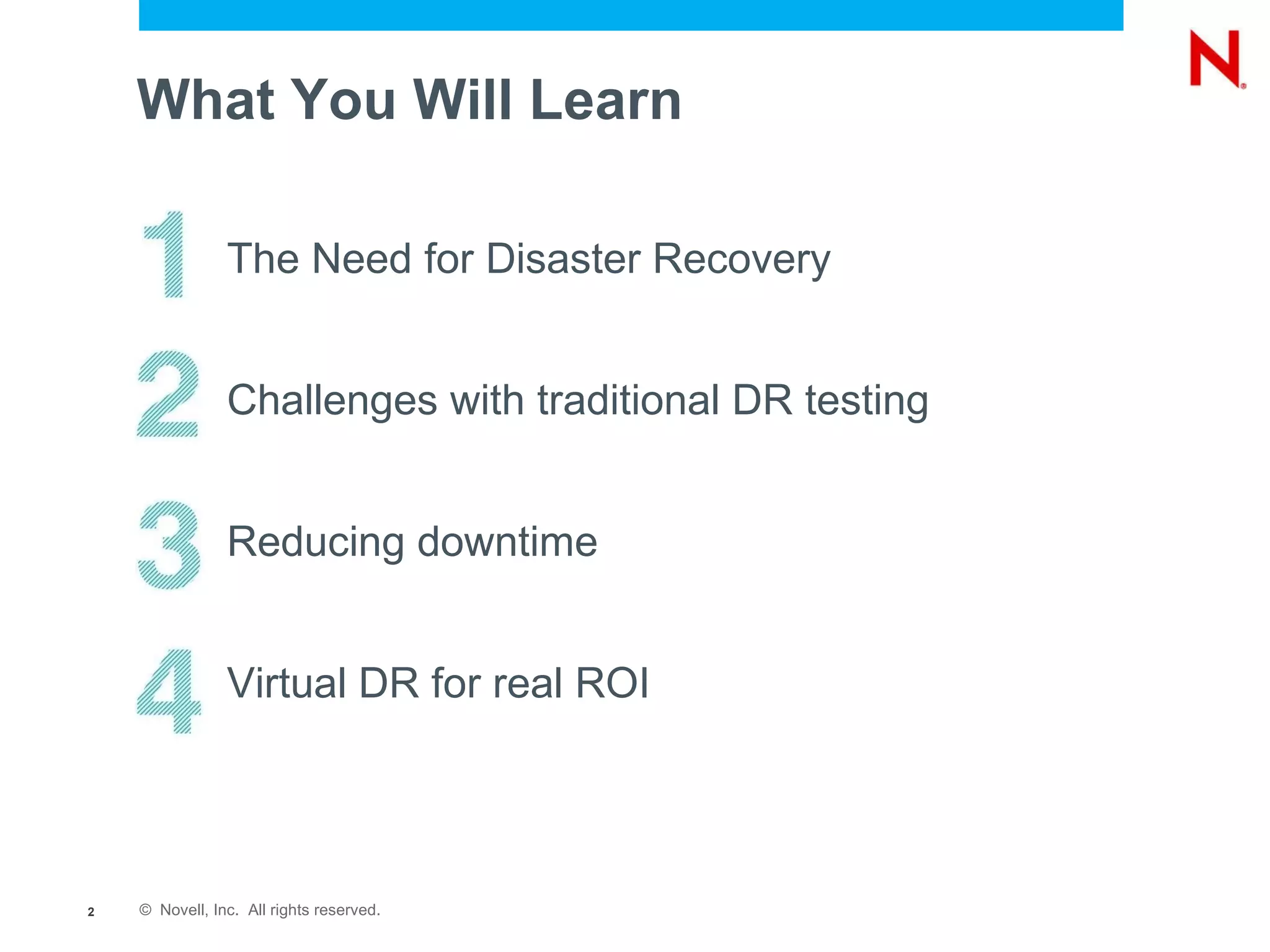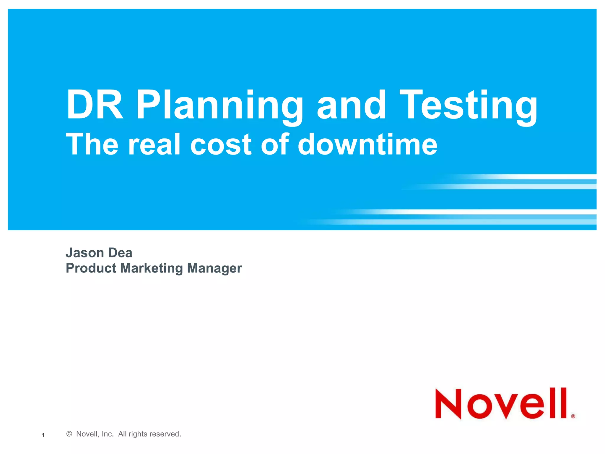 The document discusses disaster recovery (DR) planning and testing using virtual DR solutions. It notes that downtime has significant economic costs, and that most enterprises prioritize improving DR capabilities. Traditional DR testing is static, focuses on backups, and has slow recovery times. Virtual DR solutions allow replicating workloads into virtual machines, enabling one-click failover and flexible testing. This reduces recovery times and costs while improving protection of workloads. The document promotes PlateSpin Protect and Forge solutions for virtual DR and workload protection across environments.