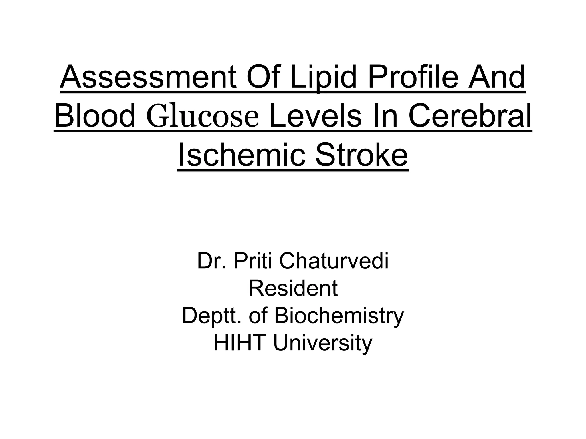 1) The study assessed lipid profiles and blood glucose levels in patients with cerebral ischemic stroke within 24 hours of onset and compared them to healthy controls.