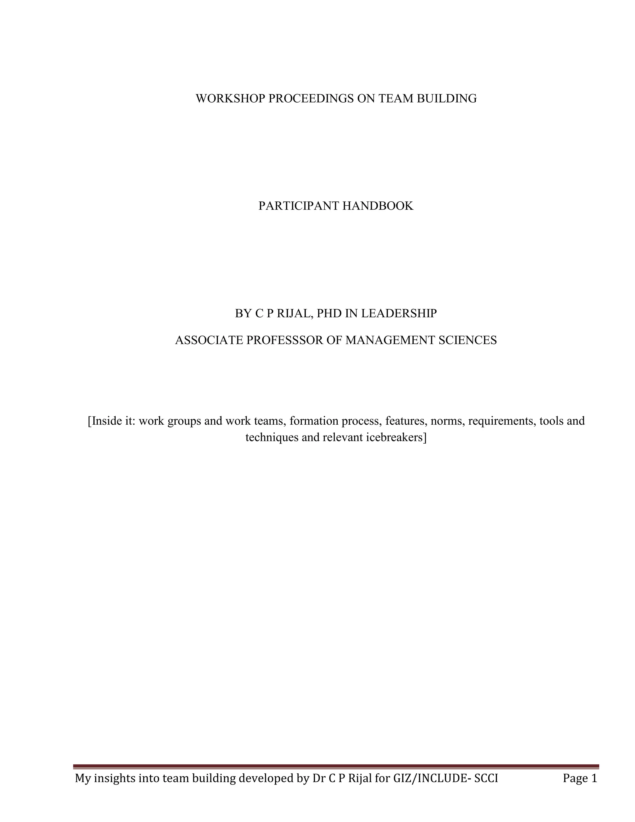 The document outlines insights into team building as developed by Dr. C.P. Rijal, focusing on the importance of work teams in organizational behavior and process climate. It emphasizes the dynamics of group interactions, the formation and development of work groups, and the individual and organizational motives behind group participation. Key concepts include the stages of group formation, types of work groups, and the significance of group cohesiveness, highlighting how effective teamwork contributes to organizational success.
