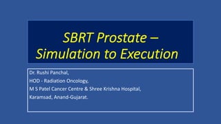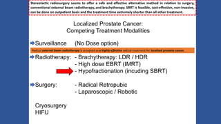 This document discusses treatment options for localized prostate cancer, highlighting the effectiveness and cost-efficiency of Stereotactic Body Radiation Therapy (SBRT) compared to traditional methods like surgery and standard radiotherapy. It emphasizes the benefits of hypofractionation due to prostate cancer's low alpha/beta ratio, enabling higher doses per fraction while maintaining toxicity levels. The document also outlines patient selection criteria for SBRT, emphasizing careful preparation and precise imaging for optimal treatment outcomes.