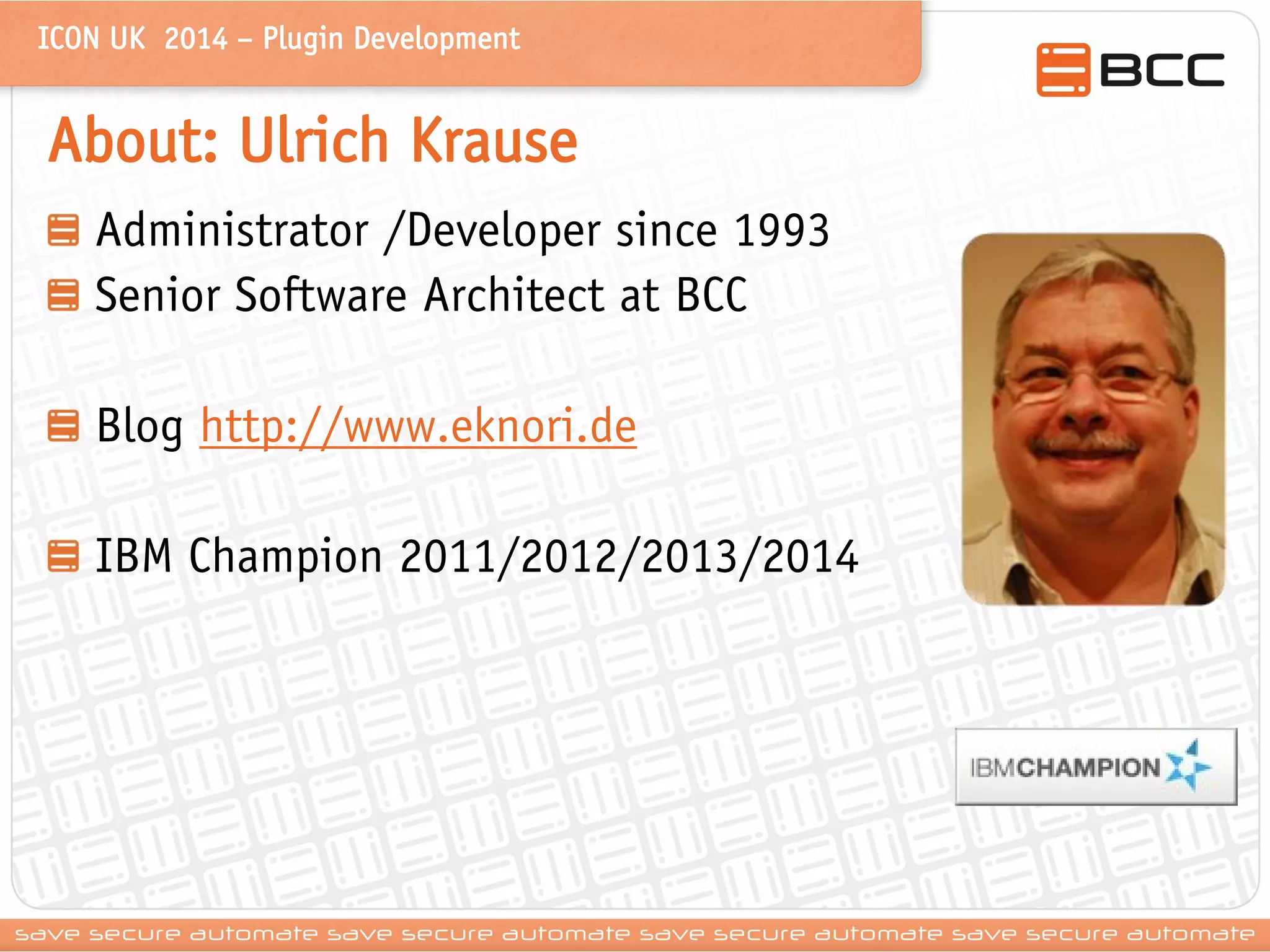 The document is a presentation by Ulrich Krause on plugin development for IBM Lotus software, detailing the types of plugins, the development environment setup, and the process to build and deploy plugins. It covers essential topics like configuring Eclipse, creating simple plugins, and understanding the anatomy of plugins, including their XML and manifest files. Additionally, it discusses plugin provisioning and deployment options for integrating plugins into the Lotus client environment.