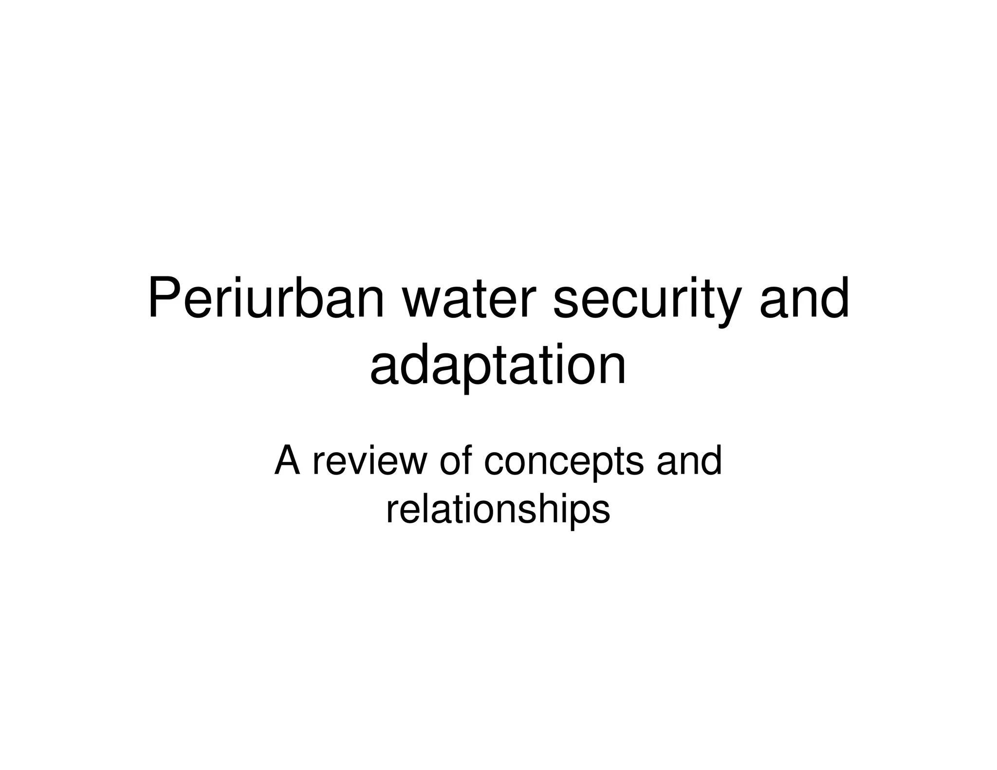 The document discusses periurban water security and adaptation, focusing on key concepts such as vulnerability, coping capacity, and the role of institutions and technology in managing water resources. It emphasizes the need for a shared glossary and understanding of terms, highlighting the complexity and changing nature of periurban areas as they transition between rural and urban landscapes. The relevance of addressing vulnerability and its factors is framed within the context of improving human well-being in the face of climate change and urbanization.