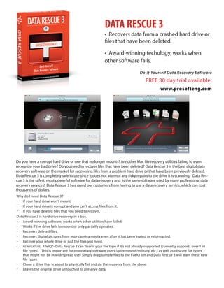 Data Rescue 3 is data recovery software that can recover files from corrupted or inaccessible hard drives, as well as recover deleted files. It is effective when other recovery software fails and works without making risky changes to the drive. Data Rescue 3 recovers a wide variety of file types and allows users to teach it new file types. It also clones drives that are failing to preserve data for recovery.