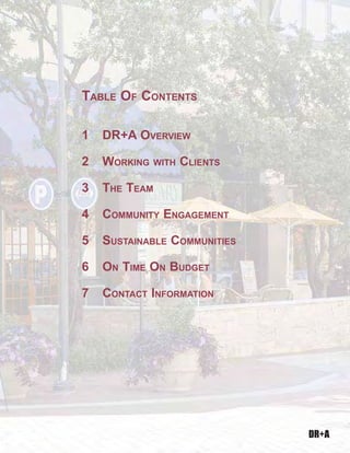 David Robbins + Associates (DR+A) is an urban planning and design firm that specializes in creating sustainable communities. The document provides an overview of DR+A's services, which include master planning, urban design, town planning, redevelopment planning, and mixed-use design. It also highlights several example projects demonstrating DR+A's work in areas like mixed-use developments, new town centers, and master planned communities.