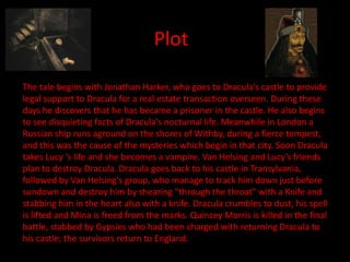 Jonathan Harker travels to Dracula's castle for a business deal but becomes imprisoned. Dracula begins killing people in London, turning Lucy Westenra into a vampire. Dr. Van Helsing and Lucy's friends work to defeat Dracula. They track him back to Transylvania and destroy him by stabbing him in the heart with a knife. However, Quincey Morris is killed in the final battle. The survivors return safely to England.