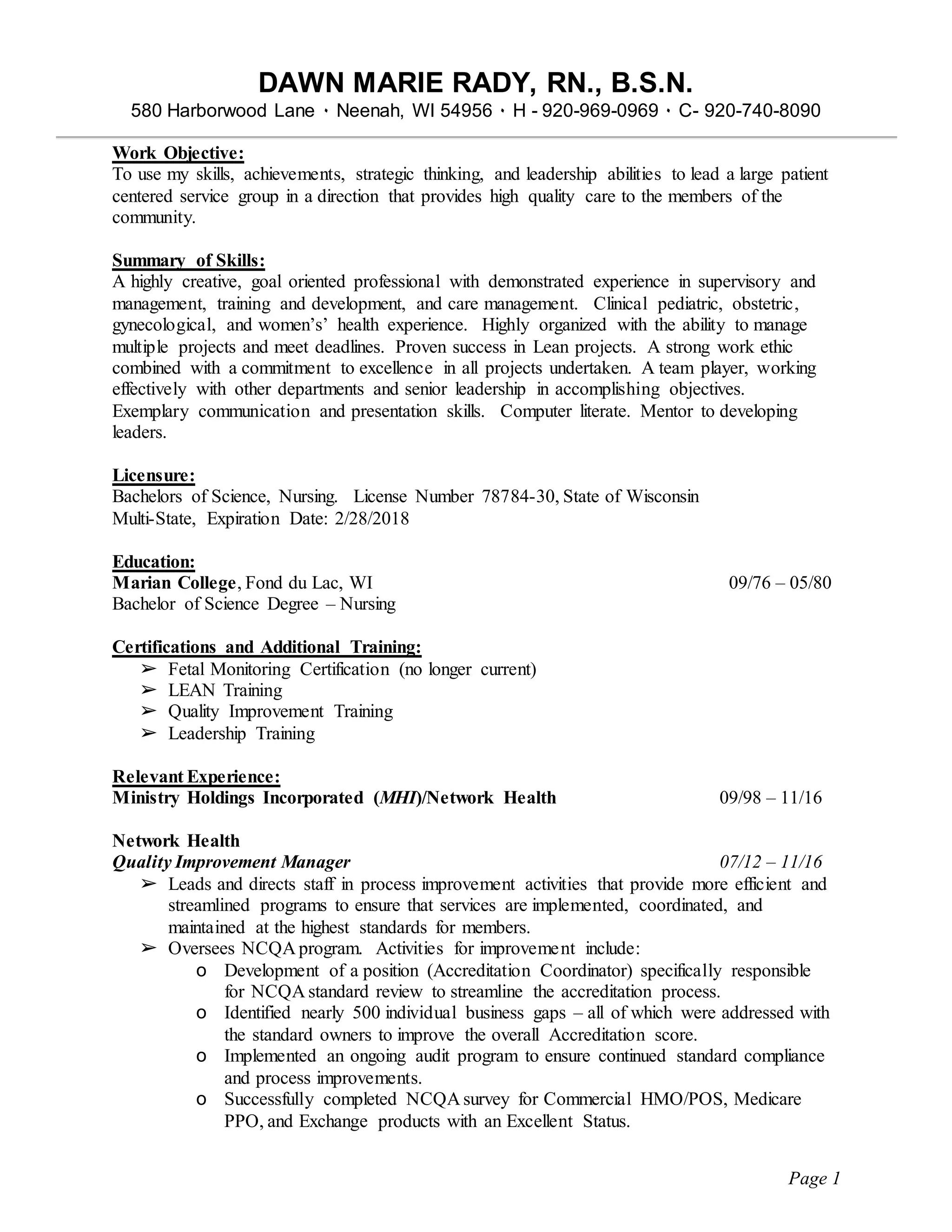 2) She has a Bachelor's in Nursing and is licensed in Wisconsin. Her education includes a nursing degree from Marian College.