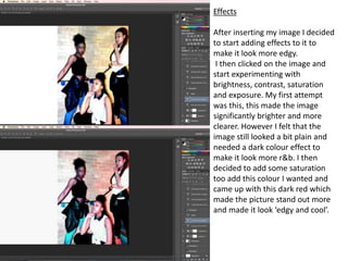 This document describes editing a photo for a magazine article in Photoshop. The author inserted the photo on the left page, which is unconventional. They experimented with brightness, contrast, saturation and exposure to make the photo look "edgy" and "cool", settling on adding dark red saturation. They were satisfied with the edited photo and focused on layout, choosing fonts for the headline and stand first text that would make them stand out.