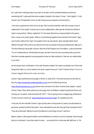 Cosmic Tiger is an up-and-coming indie pop band from Birmingham, UK consisting of 17-year-olds Eva Clarke, Brandon Cooke, Lydia Morris, and Mason Jolley. They released their debut album "Controlled" in 2017 which reached the top 40 charts in the UK. The band members come up with songs collaboratively, with each member taking on different roles in the songwriting process. Cosmic Tiger cites bands such as Maroon 5, Arctic Monkeys, and Kings of Leon as inspirations and they hope to appeal to both young and older audiences with their unique sound.