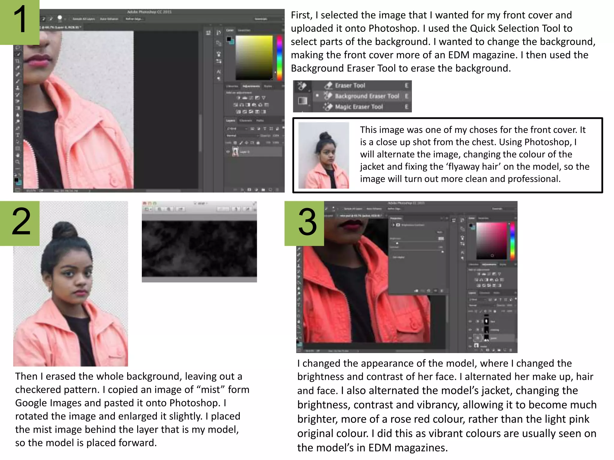 1. Selecting an image for the cover and removing the background using selection and eraser tools.