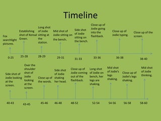 The document contains planning details for an opening film sequence. It includes a timeline with shots listed and descriptions, details on music choices, scripts, storyboards, and meeting records for coordinating the project. Key details include shots of the main character Jodie at a train station thinking and having flashbacks, discussions on costume and prop choices, and coordination of ideas among the group to complete the planning.
