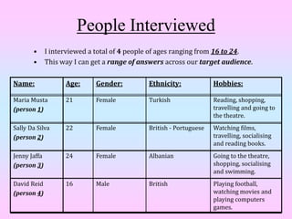 The document summarizes feedback from 4 people ages 16-24 on a documentary based on ancillary texts and an image. Overall, they thought the documentary would be about technology and social media overtaking society based on the image of a person connected to a computer by wires and blood, though some felt the image was misleading. Their opinions on watching it and the design were mixed.