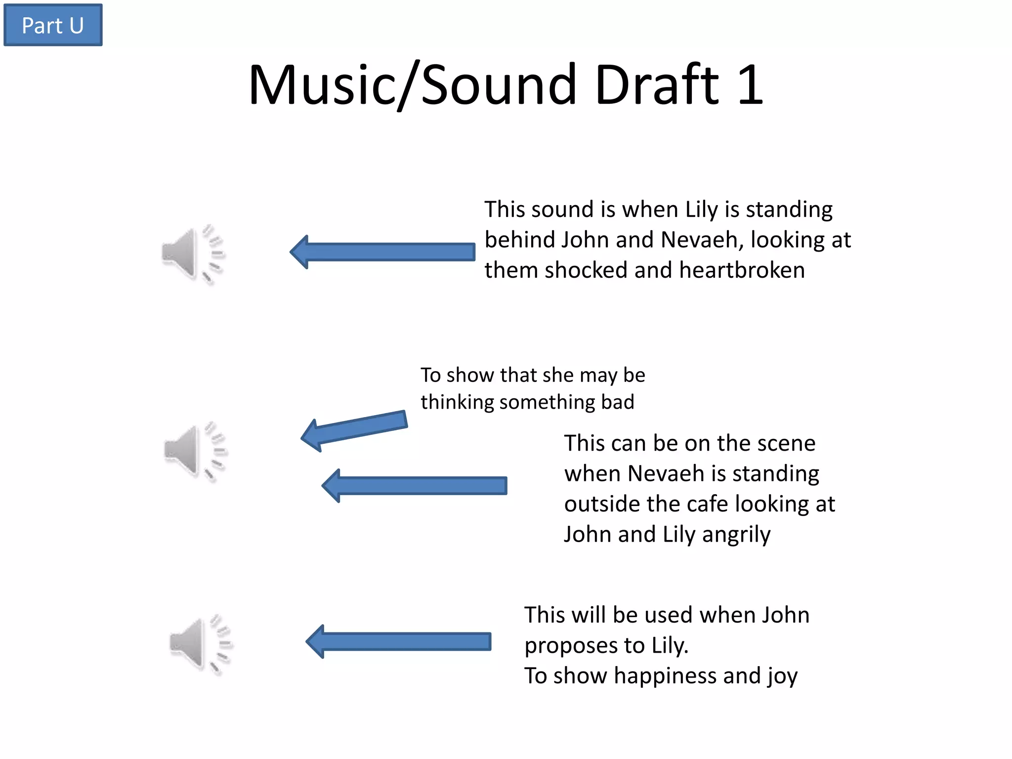 This 3 sentence document describes 3 potential sound effects for a scene: 1) A shocked and heartbroken sound for when Lily sees John and Nevaeh, 2) An angry internal thought sound for when Nevaeh sees John and Lily, 3) A happy and joyful sound for when John proposes to Lily.