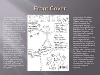 The document discusses the layout and design choices for a Christmas edition of a teen pop magazine called "Scenes". It describes designing the front cover with a large bold title, snowflakes, and popular artists to attract a young audience. It also summarizes planning the contents page with colors and images consistent with the front cover. Finally, it outlines a double page spread with a large celebrity image on the left and full interview text on the right for simplicity and impact. The goal is to emulate typical magazine styles while appropriately representing artists for a young demographic.