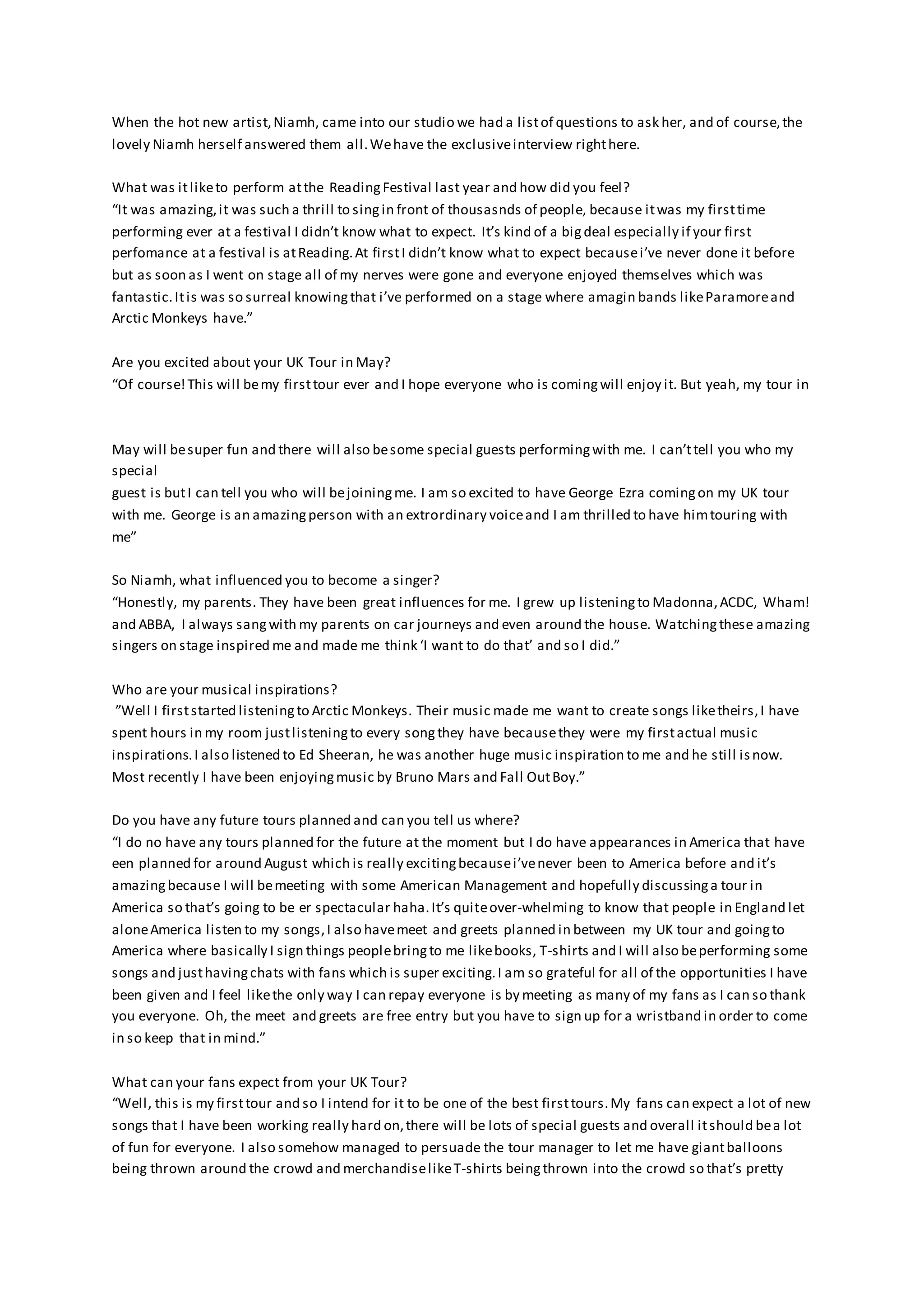 Niamh gave an exclusive interview where she discussed her experience performing at Reading Festival, her upcoming UK tour with special guest George Ezra, and her musical inspirations like Arctic Monkeys and Ed Sheeran. She started by uploading cover songs to YouTube which gained popularity and led to her music career. Niamh advised aspiring singers to keep recording themselves and being patient as success takes time.