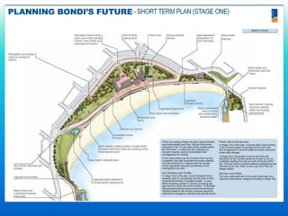 The document outlines a draft management plan for Bondi Beach Park and Pavilion, focusing on short-term and long-term changes to improve traffic, parking, and community facilities with input from stakeholders. Key proposals include restricting vehicle access, upgrading public amenities, and addressing concerns about commercial activities and the preservation of local heritage. There is a strong emphasis on detailed planning and community engagement for features such as the Bondi Pavilion and surrounding areas.