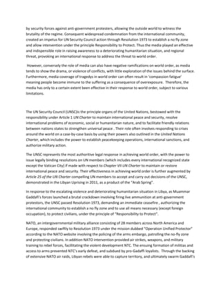 The document evaluates the effectiveness of legal and non-legal responses in resolving conflicts and maintaining world order. Political negotiations can be effective in resolving issues diplomatically but often lack political will from parties. The media plays an important role in raising awareness of issues but can also cause "compassion fatigue". The UN Security Council represents the most authoritative legal response through binding resolutions but its effectiveness depends on states' political will and is limited by sovereignty concerns. Overall, non-legal and legal measures vary in their effectiveness depending on the cooperation of international actors.
